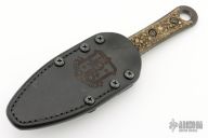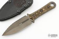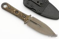 This SBD by Borka Blades and Two Saints Tactical features a DLC stonewash finished double-edged blade with one fully serrated edge, .188" blade stock and 1.594" blade depth, full tang construction. The has cast bronze scales by Two Saints Tactical. Comes with a black leather sheath by Chattanooga Leatherworks and a zippered case. New from maker at the 2023 USN Gathering.