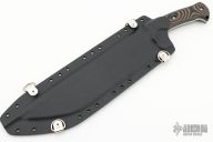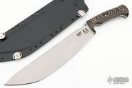 Nomad Design The Nomad was sketched out after a 2 week-long camping trip to the Sequoia National Forest back in 2012. The idea behind it is both wonderfully complicated and brilliantly simple at the same time. I wanted a knife that did what a Bowie is supposed to do historically. Chop like a hatchet, stab like a dagger and cut like a kitchen knife. So in many ways, the Nomad is just that, a big, wonderful “jack of all trades” knife that in my opinion does not suffer from some of the weaknesses associated with the traditional Bowie shape knife designs ie the more delicate tip, sometimes odd ergos and a guard to get in the way of finer jobs. So the tip was replaced with a traditional Tanto style, the guard becomes an integrated choil/guard for saving your hands in a hard stab and effectively reducing both the size of the usable blade and giving more control for finer detail work. Finally the handle, after years of working with Dark Timber Knives behind the scenes, all that ergonomic work we did on the Hooligan and Kodiak show up in this multiple position handle. Add to this package a forward cant with a long wide blade and you have a very capable large knife that looks like nothing else on the market.