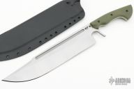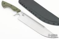 This Puzon Predator Hunter by Work Tuff Gear features a satin finished K329 Steel blade with false top edge and a convex cutting edge, has fullers, .225" blade stock and 2.601" blade depth, full tang construction with Green G-10 scales and brown G-10 liners. Comes with a nicely fitted kydex sheath, original box and zippered case. New from maker. 2nd Production Run 01-2023