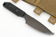 This SA-L by Mick Strider features a black drop point blade with a notched thumbrest, .143" blade stock and 1.310" blade depth, full tang construction. The handle has black gunner grip scales. Comes with a kydex sheath. New condition.