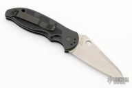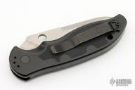 This C121 Embassy from Spyderco features a sheepsfoot style blade with swedge, small thumbhole and notched thumb ramp. The handle has an aluminum frame with black G10 inlays. Lanyard hole in pommel. Reversible black coated stainless steel tip up clip. Blade is deployed via push button with fast coil spring action. Sliding safety on "A" side of handle. Includes original box and papers.  Excellent condition.