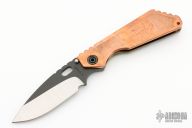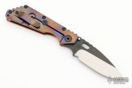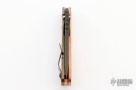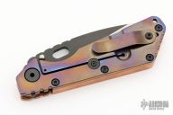 This Mick Strider Performance Series SMF framelock folder features a two-tone blade with thumbhole and notched thumbrest. The handle has a copper and anodized titanium frame with titanium clip, tip up carry. Jimping on blade spine. Includes Hinderer "Lock Bar Stabilizer" for maximum reverse lock retention. Nice detent, lockup and blade seating. New from maker at the 2023 USN Gathering. Show Special