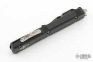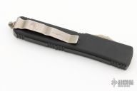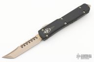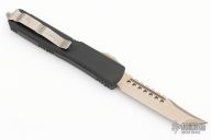 This Ultratech by Microtech Knives features a bronzed stonewashed Hellhound blade with satin flats and false top edge. The handle has a black aluminum frame with tip down blasted stainless steel clip and hardware. 08/2018. Has a few scuffs, otherwise excellent condition.