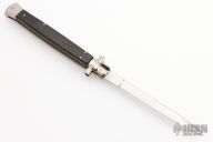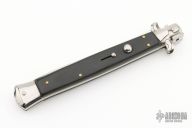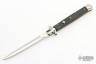 This 13" swivel bolster features a polished dagger ground blade. The handle has stainless steel bolsters, front and rear, black wood scales, brass liners, stainless spring. Excellent condition. Comes with original box and black nylon sheath.