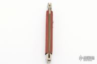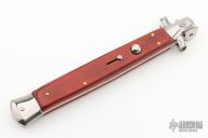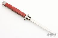 This 13" swivel bolster features a polished dagger ground blade. The handle has stainless steel bolsters, front and rear, red wood scales, brass liners, stainless spring. Excellent condition. Comes with original box and black nylon sheath.