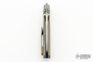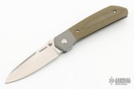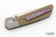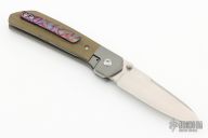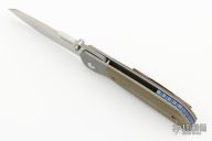 This Mula Front Flipper by Enrique Pena features a satin finished drop point blade with swedge, notched thumbrest and front flipper. The handle has bead blasted titanium bolsters with integral liners, green linen micarta scales and a tip up ZircuTi clip and an anodized titanium backspacer. Nice detent, lockup and blade seating. Comes with zippered case. New from maker!