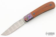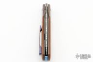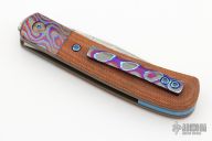 This Front Flipper by Enrique Pena features a Damasteel blade with swedge, notched thumbrest and front flipper. The handle has ZircuTi bolsters and brown canvas micarta scales, titanium liners, anodized titanium backspacer, tip up ZircuTi clip. Comes with zippered case. New from maker.