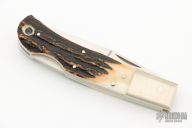 This stunning lockback folder by the late Jess Horn features a hand rubbed satin finished clip point blade with false top edge and nail nick. The handle has nickel silver bolsters with beautiful stag scales, hand peened nickel silver pins, and nickel silver liners. Satin finished stainless steel backspacer, black linen micarta spacer at the butt, and butt of handle has lanyard hole. All the lines of this knife line up perfectly. It is a truly beautiful knife. Numbered 187. Flush lockup and nice blade seating. Excellent condition. Comes with a zippered case.