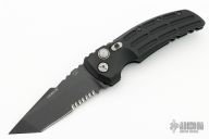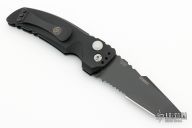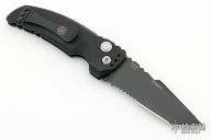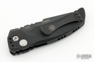 This EX-A01 by Hogue Knives is an Allen Elishewitz design, it features a black tanto partially serrated 154CM blade with notched thumbrest. The handle is black aluminum, tip up or down reversible black stainless steel clip. Has safety. Comes with Hogue box and papers. New condition.