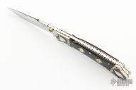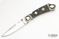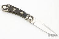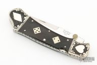 This is a wonderful sole authorship piece from legendary maker Harvey Otis McBurnette features a mirror polish drop point blade with fileworked blade spine and a checkered nickel silver thumbstud. The handle has engraved and dovetailed nickel silver bolsters, ebony wood scales with ivory dice inlays, fileworked nickel silver liners, and a fileworked stainless steel backspacer. Has a few light scratches, otherwise excellent condition.