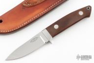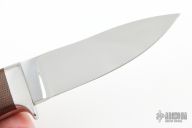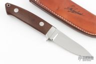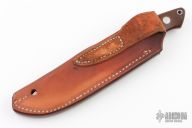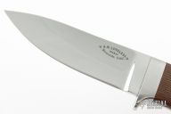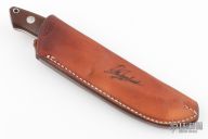 This Semi-Skinner by Bob Lovless features a mirror finish blade with the Riverside California logo. Full tapered tang construction. Blade is .20" thick and .994" deep. The handle has a satin finished stainless steel guard and brown canvas micarta scales with red liners. #883 on blade and sheath. Comes with original brown leather sheath. Has a few very fine scratches, otherwise excellent condition.