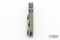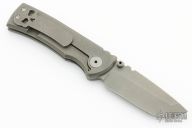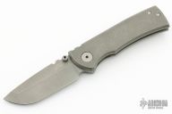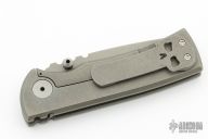 This early Chaves American Made Knives Redencion 228 is based on the popular Redencion custom knife made by Ramon Chaves. This particular piece was hand ground by Ramon. It features a tumbled drop point blade, notched thumb rest and dual thumb studs. The handle is comprised of tumbled titanium scales over titanium barrel spacers. Ramon's signature skull pocket clip is positioned for right hand, tip up carry. Great blade seating, detent and lock up. Has a couple light scuffs, otherwise excellent condition.