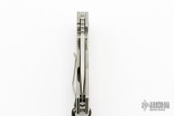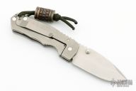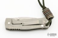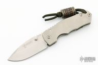This DUA framelock folder from Grayman Knives features a stonewashed blade with dual thumbstuds and notched thumbrest. The handle has a stonewashed titanium frame and tip up titanium clip. Great blade seating, detent and lock up. Has some scratches, otherwise excellent condition. Comes with a Combat Bead.