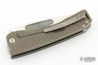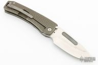 This Midi Marauder from Medford Knife and Tool features a stonewash finished drop point blade with fullers.  The handle has a textured and anodized titanium frame with a tip up clip over satin barrel spacers. Nice detent, lockup, and seating. Has some scuffs and scratches, otherwise good condition.