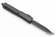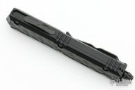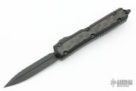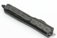 This Makora OTF automatic by Microtech features a black double edge blade. The handle has a black aluminum frame with DLC bubble inlays. Black stainless steel clip, tip down carry. Dated 06/2023 and 040 on clip. Comes with the original box. Excellent Condition.