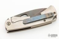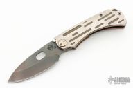 This Colonial from Medford Knife and Tool features a Vulcan finished drop point blade with thumb hole. The handle is comprised of a milled and anodized titanium frame with matching tip up clip over a a stainless steel backspacer with integrated lanyard hole. Has scuffs and scratches, otherwise good condition. Was a Monkey Edge special we think.