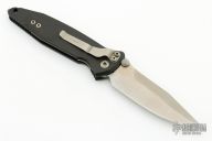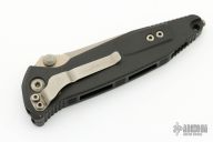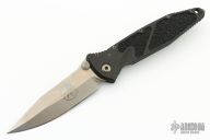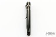 This Socom Elite from Microtech has a bronzed and stonewashed blade with dual thumbstuds and notched thumbrest. The handle has a black aluminum frame with non-slip rubber inserts and a tip down bronzed stainless steel clip. Dated 12/2018 and S/N 732. Has some scuffs, has been resharpened, has a couple small dings in the frame, otherwise good condition.