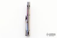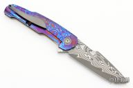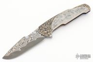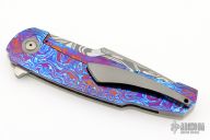 This Boudicca Flipper by Anton van der Westhuizen features a Damacore blade with a textured flipper. The handle has a hand rub satin finished titanium front scale with Gibeon Meteorite inlays, frame has been engraved with 24k gold inlays by Julian Marchal, Timascus lockside, zirconium pivot collar, backspacer and tip up clip. Rides on ceramic IKBS, nice detent, lockup and blade seating. Has concealed hardware and overtravel stop. Comes with original zippered case and COAdated 2023. New from maker!