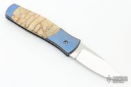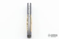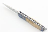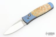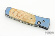 This Automatic by Z Custom Knives features a mirror polished drop point blade with file worked thumbrest. The handle is comprised of an anodized orange peel titanium frame with Tiger coral inlays and inlaid push button over a fileworked stainless steel backspacer. Has some light scuffs and scratches, otherwise great condition. Hard to find!