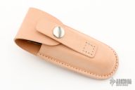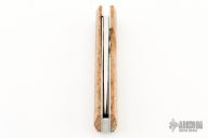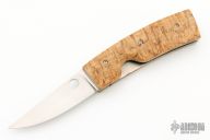 Elegantly sleek and simple, this folder is made by the Finnish master Pekka Tuominen. Hand-rubbed satin finished blade with thumbhole. The handle has titanium liners and stabilized curly birch scales. In the Puukko tradition, this knife has super smooth action, perfect lockup and excellent seating. This is an original, not the Spyderco remake. Excellent Condition. Comes with original box, sheath and papers dated 6/27/22