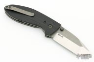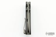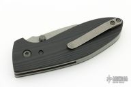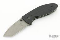 This Alpha framelock by Tom Krein features a stonewash finished chisel ground blade with dual thumbstuds and a false top edge. The handle has black G-10 scales, tumbled titanium liners and tip up clip, titanium backspacer. Nice lock up, detent and blade seating. Includes a padded case and COA. Excellent condition.