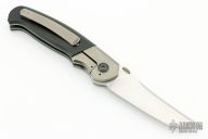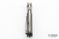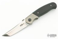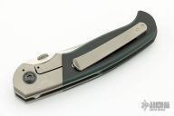 This L&L bolsterlock by David Sharp features a hand rub satin finished tanto blade with a knurled thumbdisc. The handle has a bead blasted titanium frame, very dark emerald green westinghouse scales, tip up titanium clip and a black g10 backspacer, zirconium pivot collars. Nice detent, lockup and blade seating. Comes with a zipper case. Excellent condition.