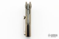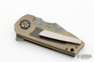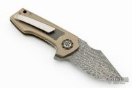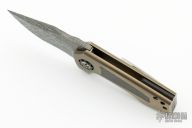 This Micro Boson flipper from Michael Burch features a Damascus blade with notched thumbrest and flipper. The handle has a bead blast and anodized finished titanium frame with carbon fiber inlays, orange peel finished tip up titanium clip with hidden screws, carbon fiber pivot collars, inlays, and backspacer. Nice detent, lockup and blade seating, rides on bearings. Comes with velcro pouch. Excellent condition.