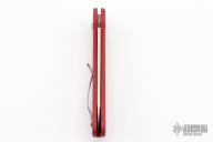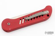 This Slotted Seal Side Opening Auto by Rob Dalton has a satin finished drop point blade with swedge. Handle is red anodized aluminum with slots, bead blasted stainless steel tip up clip, and lanyard hole. Has a couple light scuffs, otherwise excellent condition.