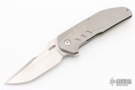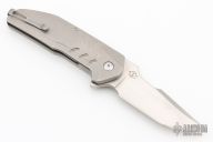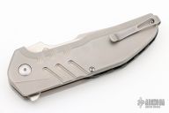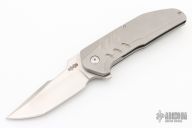 This knife is a collaboration between Brous Blades and Turpin Knives. It features a satin finished spear point blade with notched thumbrest and a flipper. The handle has a milled and bead blasted titanium frame, tip up bead blasted stainless steel clip.  Black G-10 backspacer.  Includes a padded zippered case.  Excellent Condition.