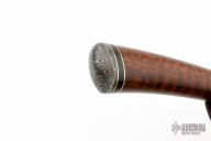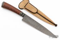 This knife by Mauricio C Daletzky features a Damascus blade with false top edge and an integral fluted guard, .200" blade stock and 1.322" blade depth, hidden tang construction with a mosaic Damascus butt, snakewood grip with nickel silver and carbon fiber spacers. Comes with a brown leather sheath, leather zippered case. New from maker!