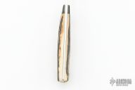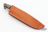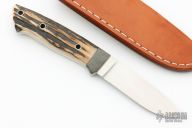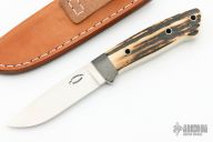 This Hunter by Dietmar Kressler with hand rub satin finished blade with .131" blade stock and .931" blade depth, full tapered tang construction. The handle has carbon fiber bolsters, stag scales. Comes with a brown leather sheath and a zippered case. Excellent condition.