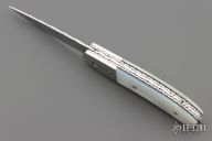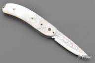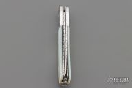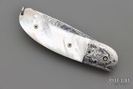 This Scale Release Auto by Mike Whiskers Allen features an engraved blade with fileworked spine. The handle has engraved stainless dovetailed bolsters, Mother of Pearl scales, fileworked stainless steel liners and backspacer. "03 2001" inside backspacer. Nice action, lockup and blade seating. Excellent condition.