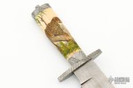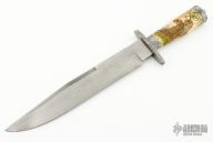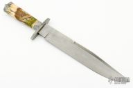 This Bowie by Jerry Rados features a Turkish Twist Damascus blade with false top edge and fileworked blade spine, .292" blade stock and 1.862" blade depth, hidden tang construction. The handle has a fileworked Damascus guard, collar, butt and finial, scrimshawed walrus ivory grip done by "Curtis" in 1992. Comes with a zippered case. Excellent condition. Stunning piece.