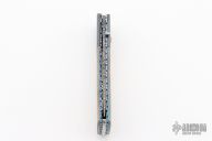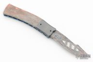 This Button Release D/A Auto by Wayne Whittaker features a Damascus blade with fileworked spine and single thumbstud with inlaid ruby. The handle has blued stainless dovetailed bolsters, fossil mammoth ivory scales, fileworked and anodized titanium liners and a fileworked stainless steel backspacer. Nice action. Has a little blade play, and some light scratches, otherwise excellent condition.