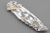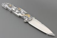 This linerlock flipper by Sergio Consoli features a hand rub satin finished blade with a flipper. The handle has engraved stainless steel scales with 24k gold inlays, Inox steel liners, engraved stainless steel backspacer. Sergio's ball bearing system gives the knife an effortless flip that requires no wrist action. Nice lockup, detent and blade seating. Engraving done by Omar Consoli. Excellent condition. Comes with zippered case and COA dated June 2015.