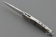 "Creating a knife by hand is what I consider a real art form. The passion for the cutting tools has always been in me and has grown with me until the decision to build my first knife alone. I started at 40, in 2003, practically self-taught, I had no experience of manual work, but I had done for many years the mechanical designer and this allowed me to know perfectly the technique and all the various stages of mechanical processing. Currently I am a member of The Italian Knife Guild, with a rank of Maestro. What I do now is what I consider my art form, creating "craft, hunting and collectible knives". They are knives made entirely by hand, only with an infinite series of files, a small drill for the holes and a sander for the concave grinding of the blades, nothing else. I create especially folding knives, which satisfy more my desire to build perfect mechanical objects and precisely the perfection in the smallest details, even inside where you can not see. Of course with the passing of the years I have refined my technique and currently I have improved even more. The mechanism inserting on the blade rotation a system of ball bearings, which guarantee an absolutely perfect seal and allow the blade to close and open without the least friction and with an incredible sweetness. With regard to the blades then, I'm experimenting with new types of hardening, which give hardness of 62-63 HRC and allow a thread seal and exceptional cutting quality for all types of use. I realize virtually all the knives on my initial design, they are all unique pieces made entirely by hand up into the smallest details, one at a time, so that, in my opinion, a knife can be considered "handmade". For the blades I prefer RWL34 steel which is sintered by powders and guarantees the total absence of internal defects, I sometimes use even the damask, both stainless and carbon. For the handles, one of the most beautiful materials is the mammoth tooth, which can be found in a variety of colors all beautiful, I also use the fossil ivory of mammoths, various roots, titanium and carbon fiber. Most of the knives, however, 'I do it completely in steel, to be able to then be engraved, always and strictly by hand, to transform even more' knife, into a real work of art ..."