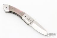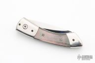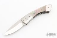 This Scale Release Auto by Wayne Whittaker features a mirror polish drop point blade. The handle has polished double bolsters, black lip pearl scales, fileworked titanium liners and a fileworked stainless steel backspacer. Nice action, lockup and blade seating. Comes with zipper case. Has some light scratches on the blade and bolsters, but otherwise excellent condition.