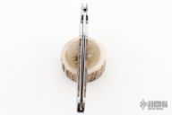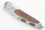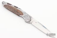 This Interframe Lockback from Warren Osborne features a hand rub satin finished blade with nail nick. The handle has a stainless steel frame with Biggs Jasper inlays. The frame has been engraved by K Horvath. Excellent condition. #004