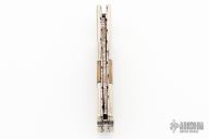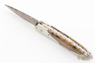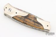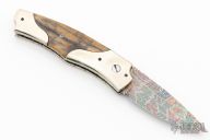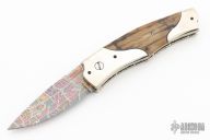 This Scale Release Auto by Wayne Whittaker features a mosaic Damascus drop point blade. The handle has mirror polish nickel silver double bolsters, mammoth scales, fileworked titanium liners and a fileworked stainless steel backspacer. Nice action, lockup and blade seating. Has some light scratches, otherwise excellent condition.