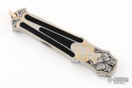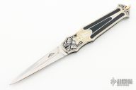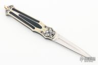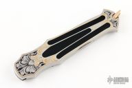 This Interframe Lockback Auto by Warren Osborne features a hand rub satin finished dagger blade with false top edge and fullers. The handle has a stainless steel frame with black Jade inlays and stainless steel backspacer, has been beautifully engraved with gold inlays by Julie Warenski. Nice lockup and blade seating. Excellent condition.