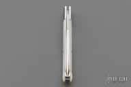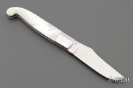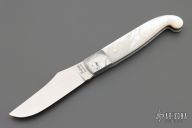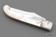 This linerlock by Boiteddu Fogarizzu features a hand rub satin finished blade. The handle has dovetailed stainless steel bolsters, mother of pearl scales, stainless steel liners and backspacer. One of the bolsters has been engraved with a horse head by Firmo Fracassi. Excellent condition.