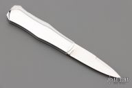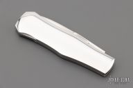 This Coke Bottle Lockback by Steve Hoel features a hand rubbed satin finished blade with nail nick. The handle has a mirror polished stainless steel frame. Nice lockup and blade seating. Beautiful piece, excellent condition. Ready to be engraved!