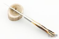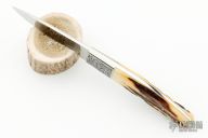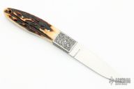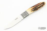This "Jody" Knife by Steve Johnson features a mirror polished blade with .117" blade thickness and .731" blade depth, full tapered tang construction. The handle has an engraved stainless steel guard with notched thumb and finger rest, stag scales with gold pins and lanyard hole. Comes with a Velcro case. Great look and feel. Excellent fit and finish. Excellent condition. Engraved by Stanley Stoltz. #014