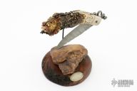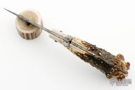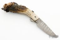 This Forged Scroll Friction Folder by Larry Fuegen features a Damascus blade with carved and engraved spine and friction bar. The handle is carved from a single piece of crown stag with fileworked nickel silver liners, fileworked steel backspacer, Garnets for eyes, 14k gold tongue that moves inside the mouth. Every inch of this knife has been embellished, including the entire inside of the knife. Comes with a wood and stone display stand. Stunning. Excellent condition. Comes with a zippered case.