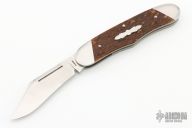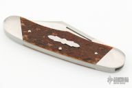 This knife by Tom Ploppert features a hand rub satin finished blade with nail nick. The handle has stainless steel bolsters/liners, jigged bone scales, stainless steel escutcheon, stainless steel spring. Half-stop, flush in all positions. Includes a padded zippered case.  New from Maker!