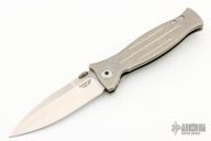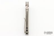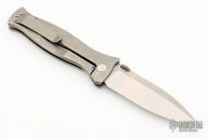 This MK3 by Les George features a satin finished blade with false top edge and knurled thumbdisc. The handle has a stonewashed titanium frame with 3 milled fullers and a titanium tip up clip. Nice detent, lockup and blade seating. Comes with a zippered case. New condition.