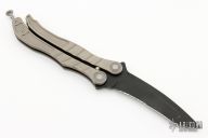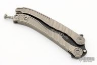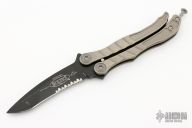 This 170-4 Metalmark from Microtech features a black partially serrated blade with swedge. The handle is comprised of bead blasted titanium with spring loaded latch on pommel. Includes original box and paperwork. S/N 00377 and dated 08/2012. Has some scuffs and scratches, the latch doesn't lock, otherwise good condition.