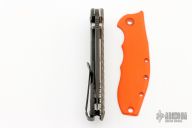 This Hinderer Designed 0562 Framelock Flipper has a black blade with swedge, notched thumbrest, dual thumb studs and flipper. Handle has a custom G-10 scale by "The Preacher", comes with original orange G-10 scale, black titanium - with stainless steel lockbar insert and lockbar stabililzer. Black stainless steel clip is tip up. Dead center blade seating, flips like a champ, and has rock solid lockup. Extremely well made piece. Excellent condition. #0287 Comes with original box and papers.