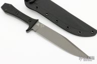 This Sandbar Bowie by Tops and Sterling F. Buster Cutlery Co. was made for Fight'n Rooster. It features a Tungsten Cerakoted blade with .181" blade stock and 1.406" blade depth, full tang construction with black G-10 scales with white liners. Comes with a kydex sheath with belt clip, and original packaging. New from maker. #23-073