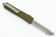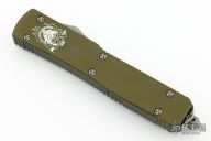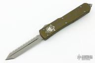This knife from Microtech was the 2015 USN G7 Show Special. It has a double edged tanto blade with an Apocalyptic finish and a fully serrated edge, blood grooves and holes in blade. The handle is green aluminum with a tip down Apocalyptic finished stainless clip and glass breaker at the butt. Comes with original box and papers. Excellent condition.